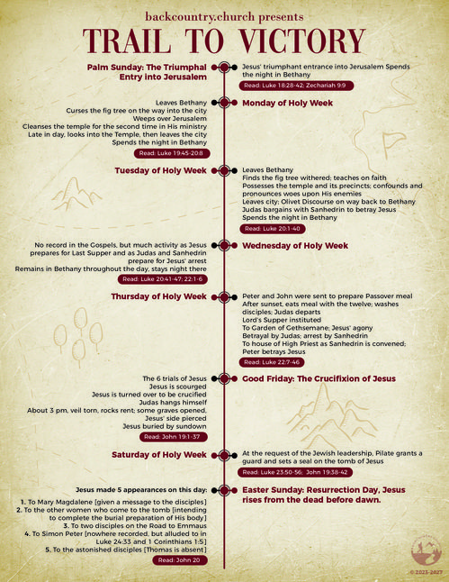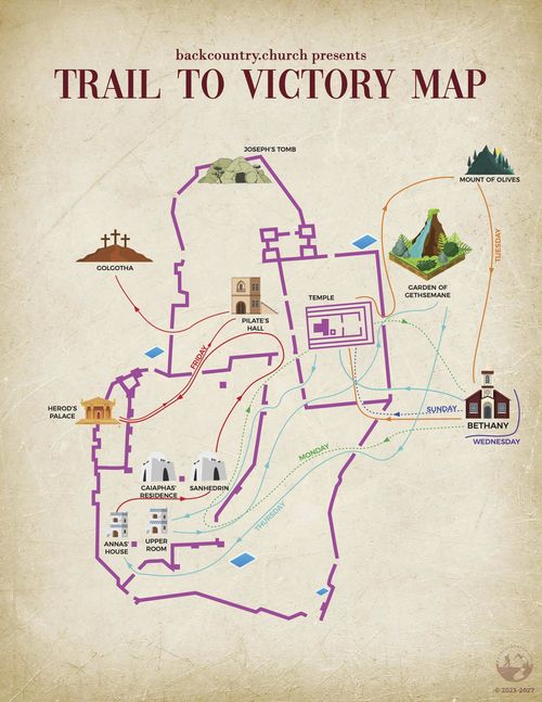 Encounter the Empty Tomb like never before. Join backcountry.church beginning on Palm Sunday, March 24, as we experience what Jesus did each day. This week long event will include 1) a detailed timeline of His daily journey, 2) A daily reading for you to first hand journey with Jesus, 3) a map of where He went (download these below) and 4) a unique backcountry.church daily video (will be posted in the Media section).